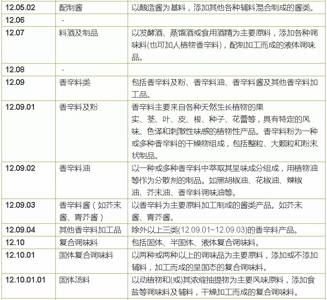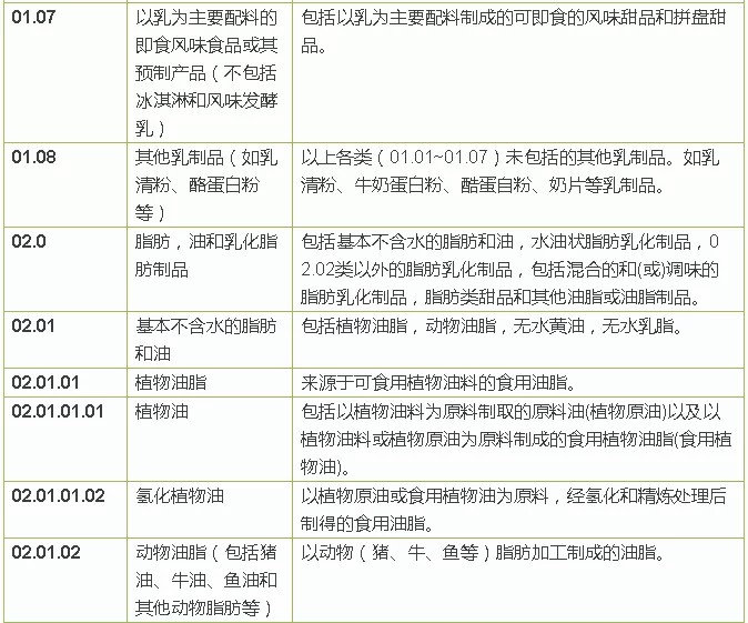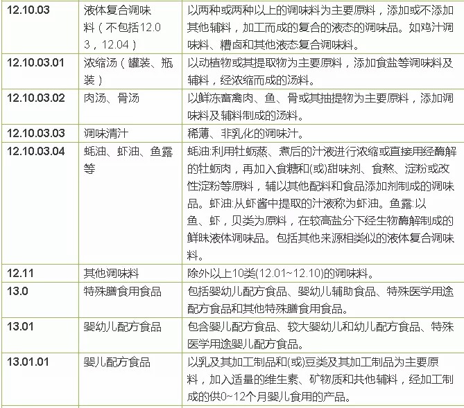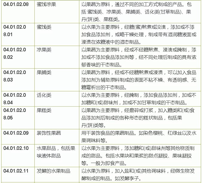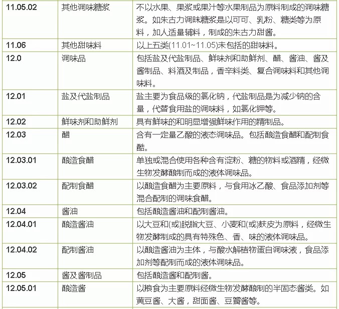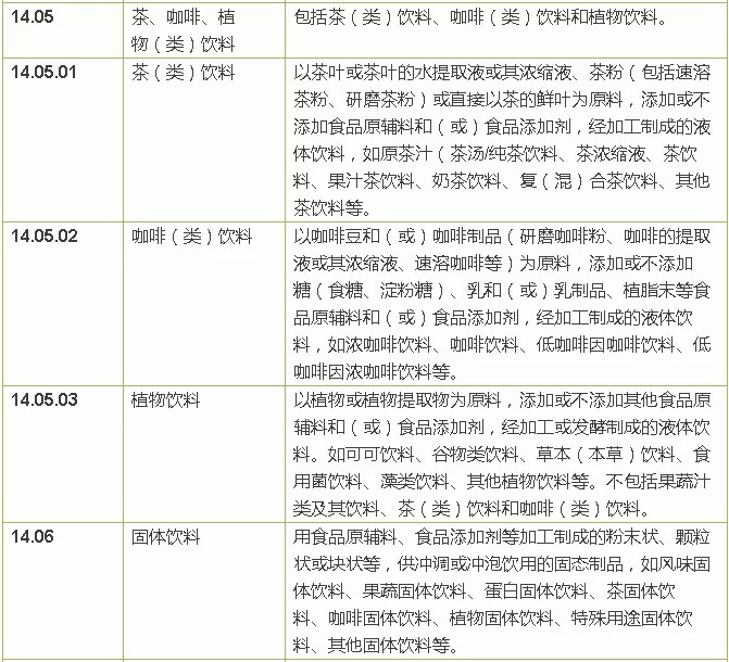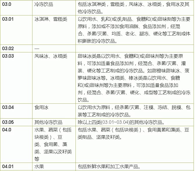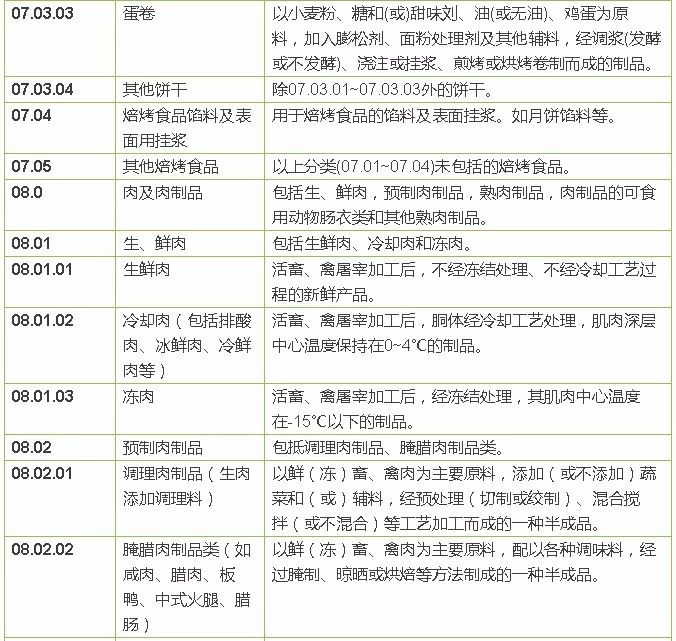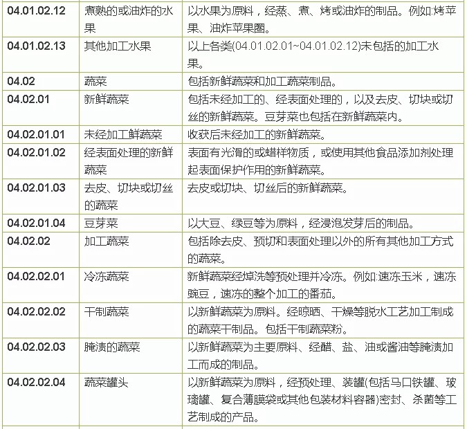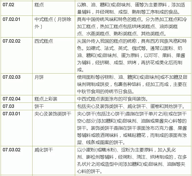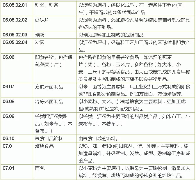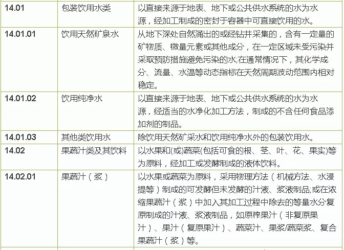 1、食品分類采用《GB 2760-2014 食品安全國家標準 食品添加劑使用標準》中的“食品分類系統(tǒng)”,包含16大類食品。 2、GB 2760-2014中的食品分類除“調味品、特殊膳食、飲料類、酒類和其它類等類別”之外,大部分是按照“食品主原料”進行分類。因此,在食品生產許可分類中的一些產品類別需要根據食品的主要原料在“2760食品分類系統(tǒng)”中查找。舉例如下: (1)“餅干”、“糕點”等在“焙烤食品”中查找。 (2)“食糖”、“蜂蜜”在“甜味料”中查找。 (3)“糖果”、“可可及焙烤咖啡”在“可可、巧克力及糖果”中查找。 (4)“罐頭類食品”、“速凍食品”等則需根據原料來查找。如“畜肉罐頭”和“禽類罐頭”在“肉及肉制品”的“熟肉制品”下;“八寶粥罐頭”則在“糧食及糧食加工品”的“雜糧制品—八寶粥罐頭”下;“蔬菜罐頭”在“水果、蔬菜及其制品”的“蔬菜—加工蔬菜—蔬菜罐頭”下;“水果罐頭”則在“水果、蔬菜及其加工制品”的“水果—加工水果—水果罐頭”下。 |